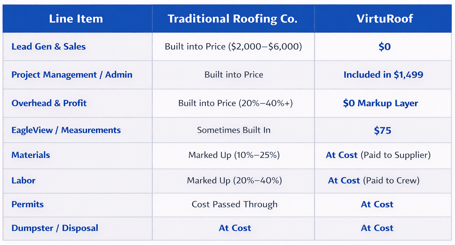 No in-home salesperson. No padded pricing. VirtuRoof uses 'EagleView' satellite software to accurately take your roof measurements, walks you through the full scope of the implementation during your consultation, and keeps the rest of the project at-cost with payments going directly to the supplier and installer - not a markup layer.